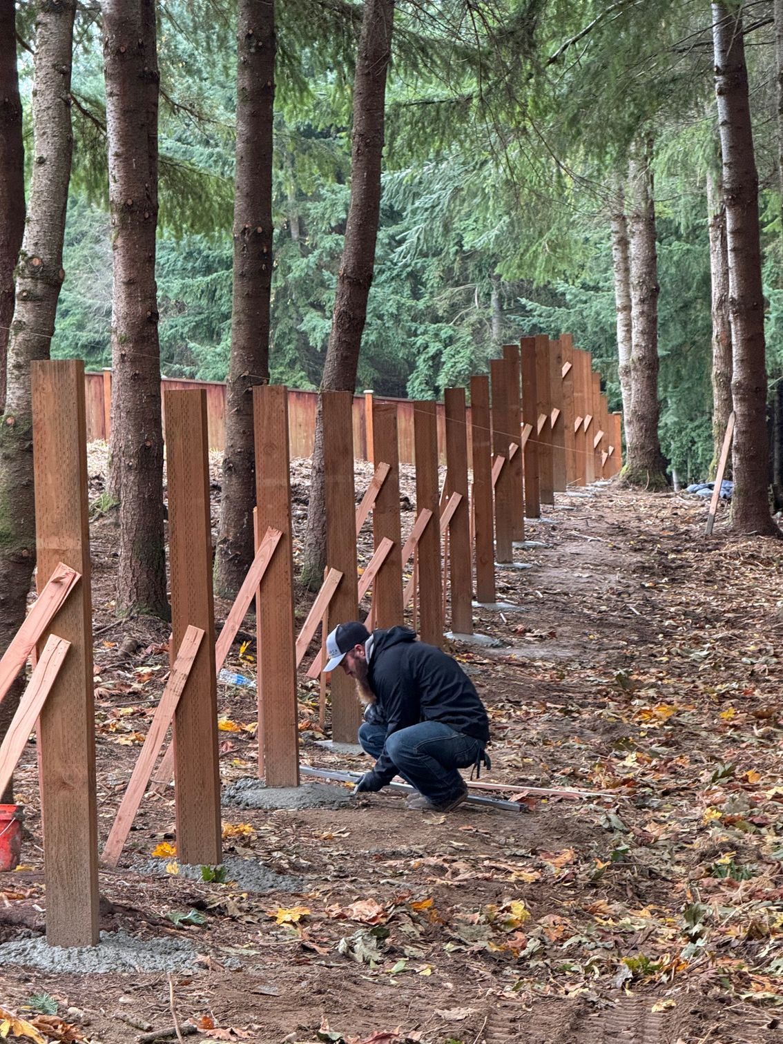 Orca completed the Dirt work, Tree felling and parking out, fencing and gates, and a simple landscape, and a stone entry. Josh and the guys at LeFeber turf farm did an amazing job hydro-seeding this 1 acre parcel.