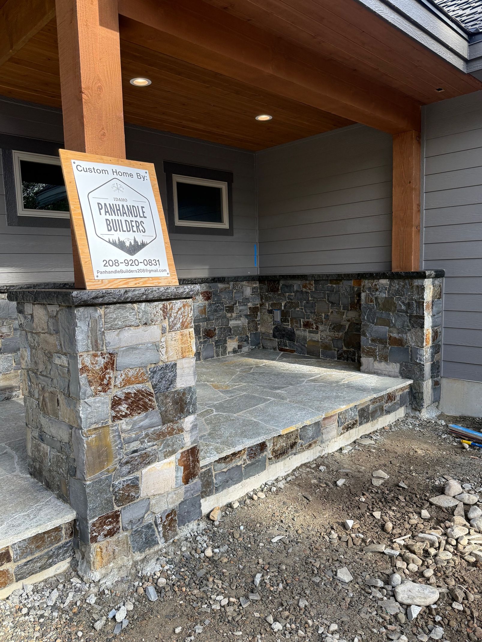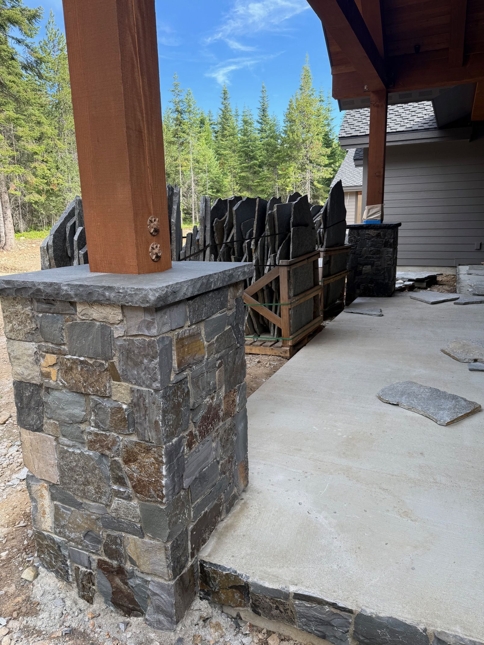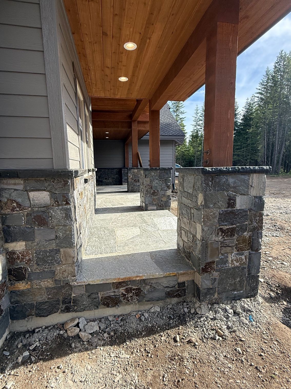 Beautiful custom home built by Aaron Mickels of Panhandle Builders. This build includes Montana Rocks works Moose Mountain Veneer, Custom hand pitched basalt pillar caps and ledge stone, and mortar set Idaho quartzite patios.