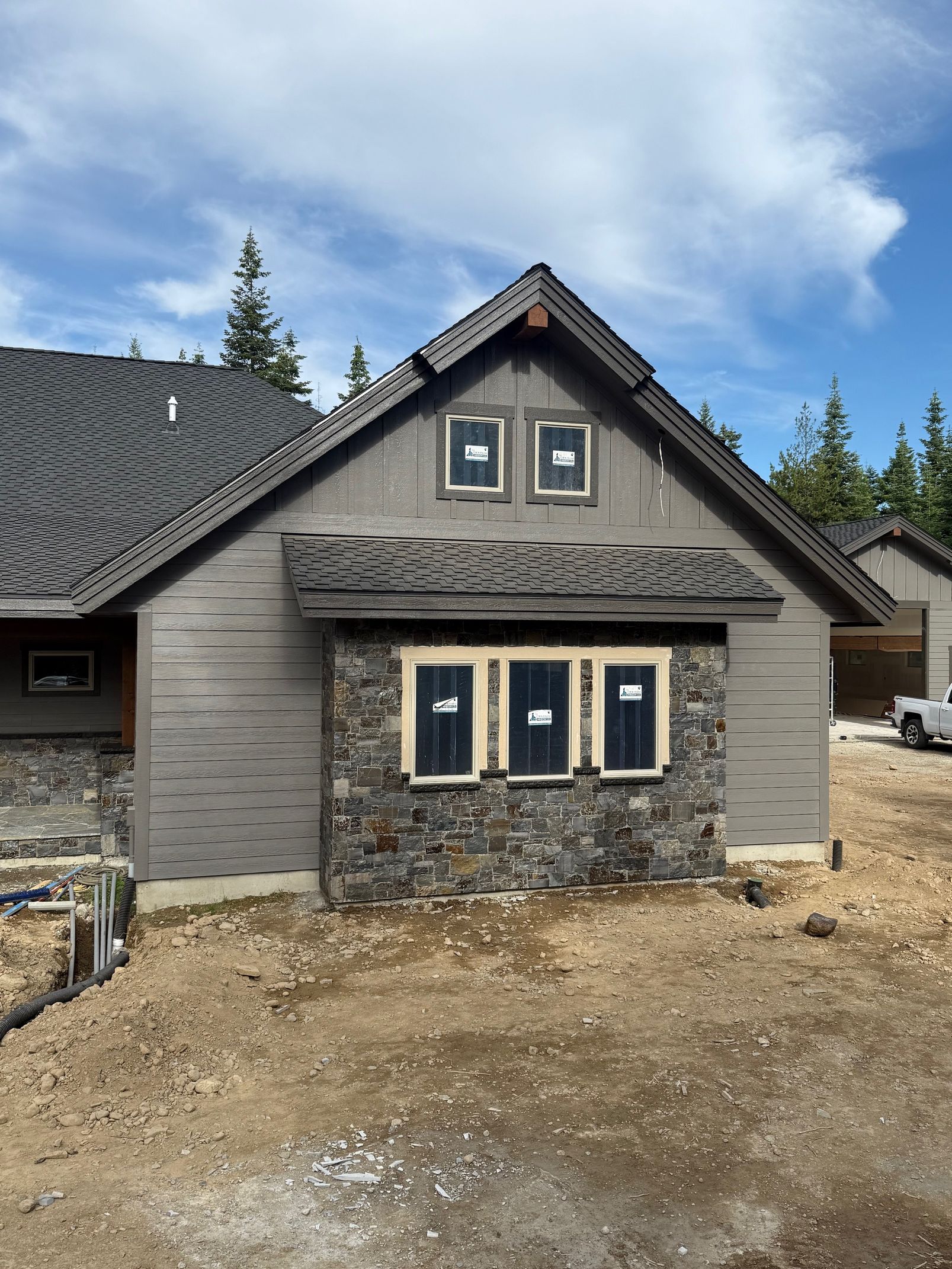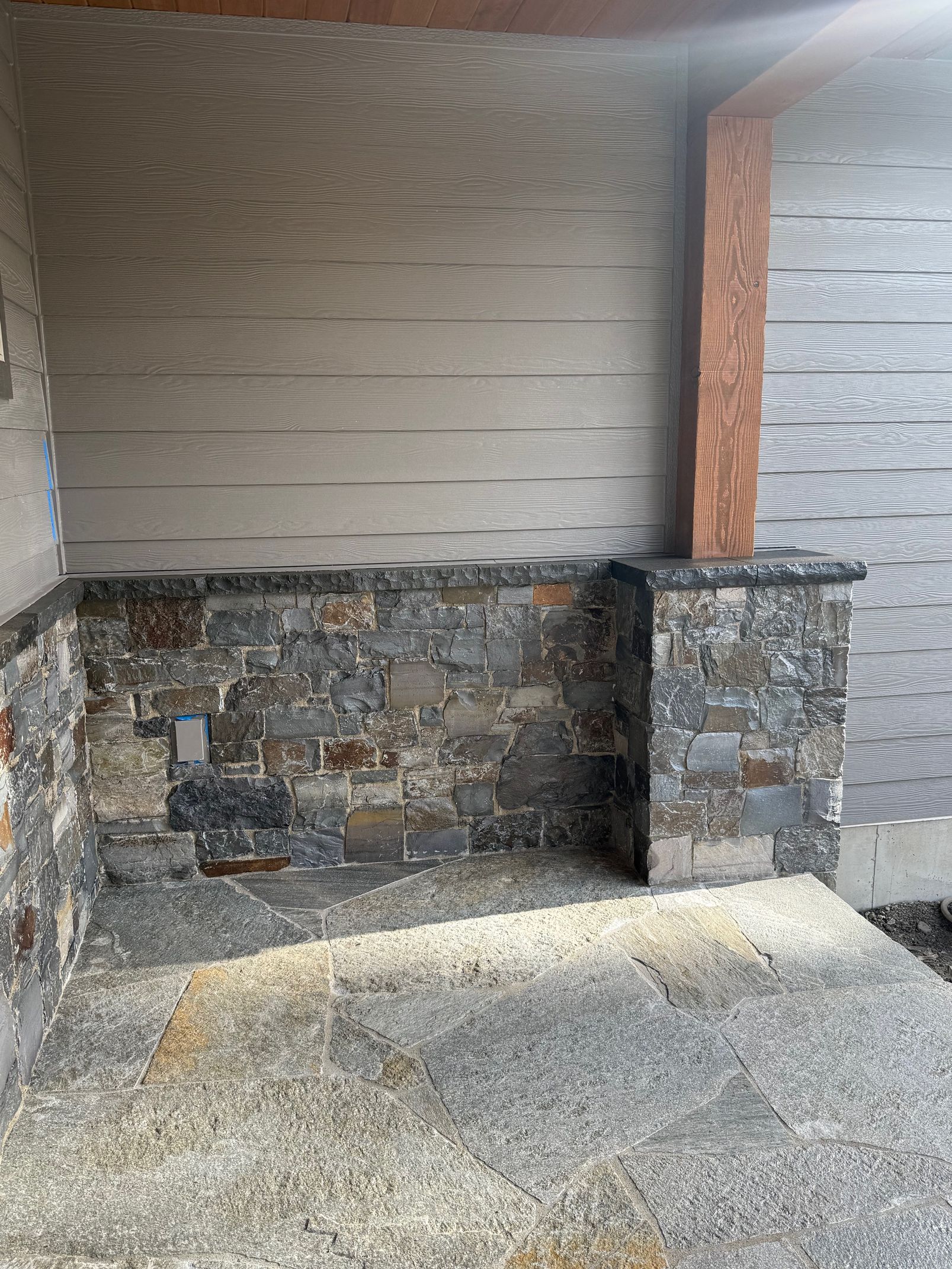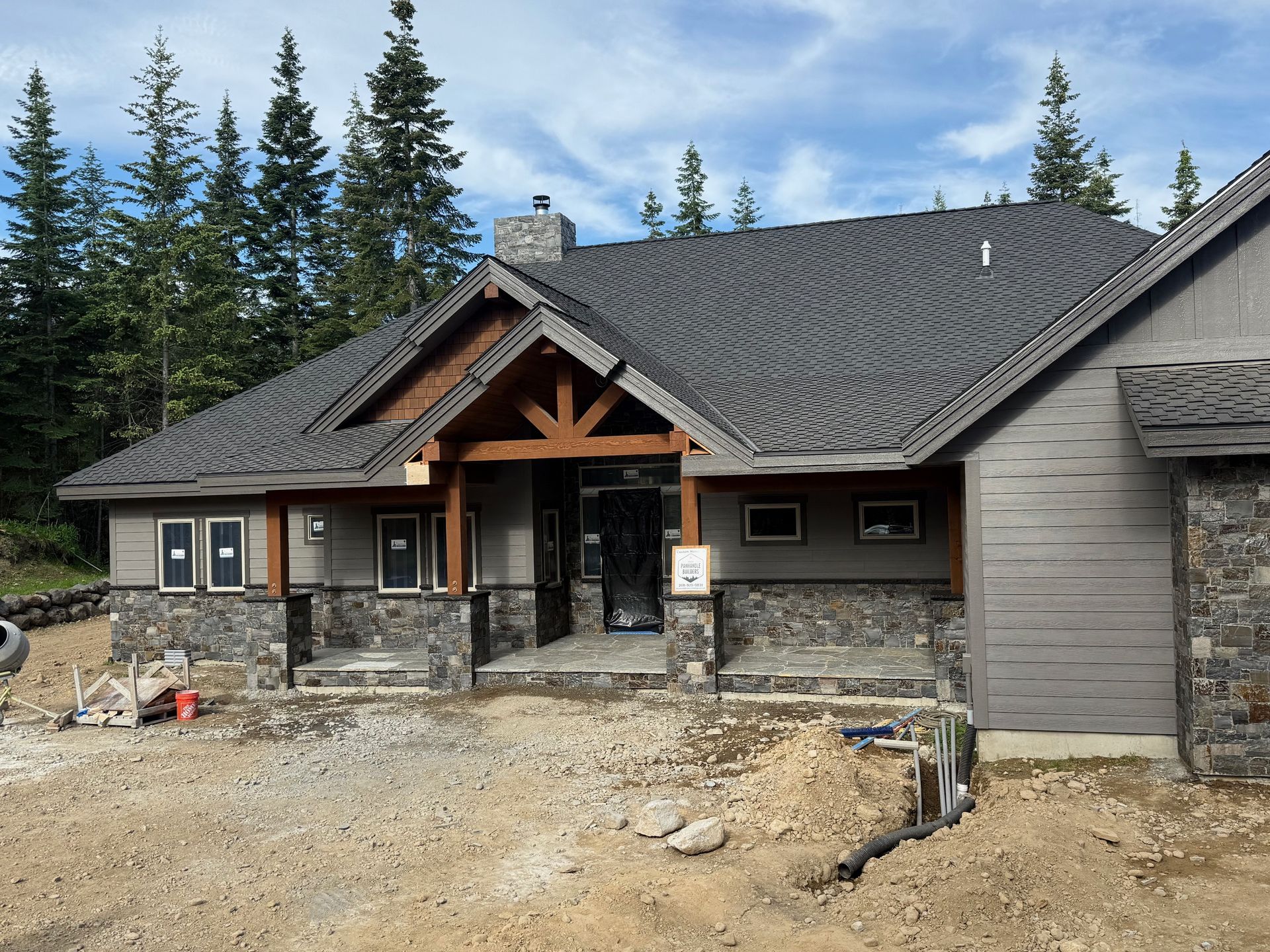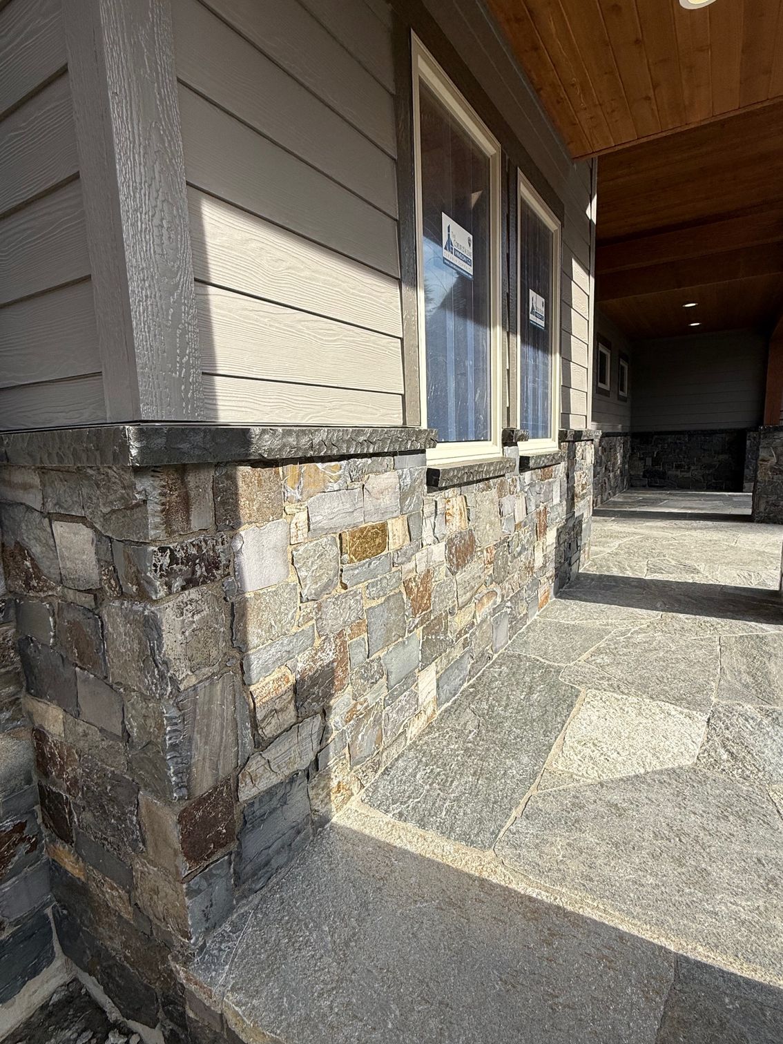 Beautiful custom home built by Aaron Mickels of Panhandle Builders. This build includes Montana Rocks works Moose Mountain Veneer, Custom hand pitched basalt pillar caps and ledge stone, and mortar set Idaho quartzite patios.